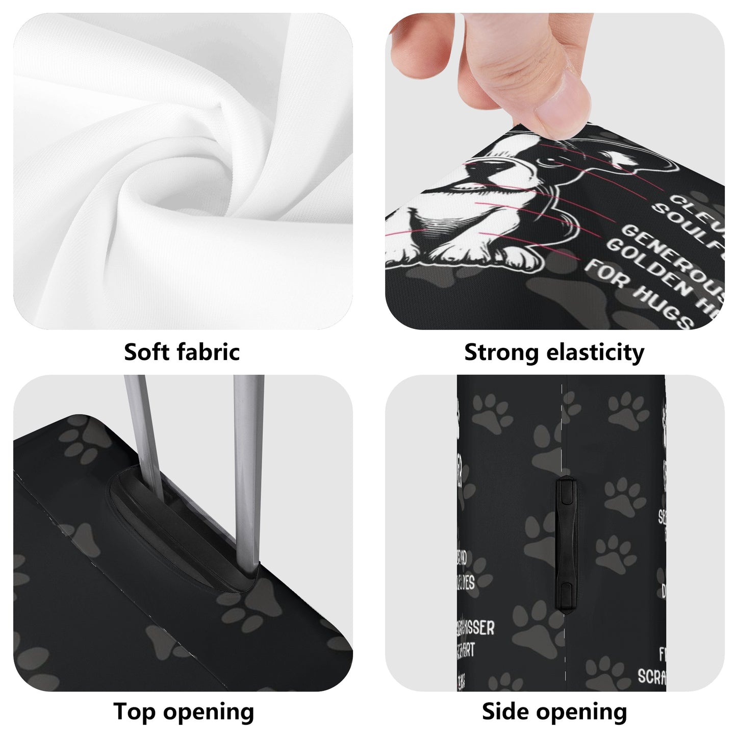 The case cover comes in four sizes (S-XL) that correspond to different luggage box models. It has a unique opening on top for the telescopic handle and carry handle, and zippers on both sides for the side handles. This makes it easy to load and unload your luggage without removing the case cover.