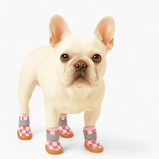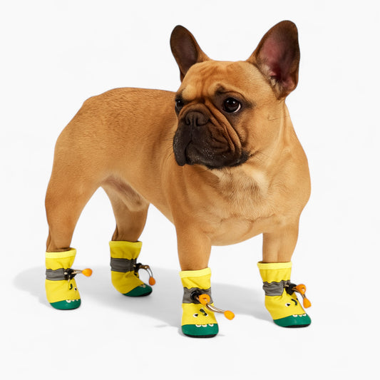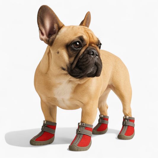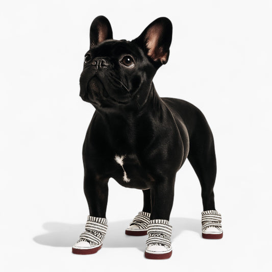 Nuestros zapatos para perros Frenchie ofrecen una excelente resistencia a la intemperie y a las superficies dañadas. Equipados con suelas antideslizantes de goma o silicona, correas de velcro y materiales impermeables, estos zapatos permiten que tu Bulldog Francés camine con facilidad.
