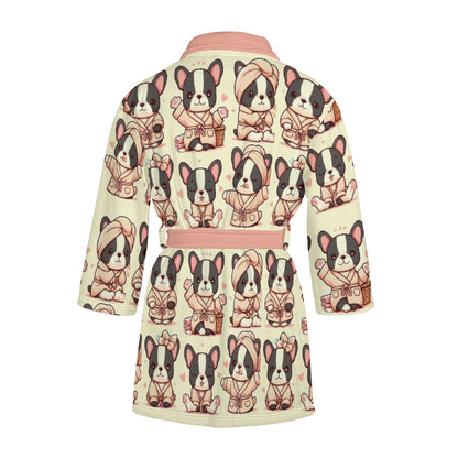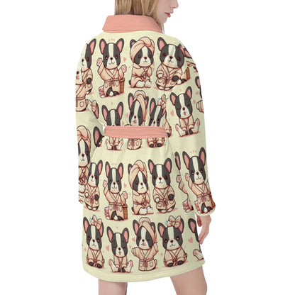 Introducing our exclusive Women's Bathrobe, designed for the ultimate comfort of Frenchies lovers. Crafted from a lightweight Polyester Blend fabric, this bathrobe is not only irresistibly soft but also perfect for lounging in style. The self-tie belt ensures a secure and stylish universal fit, allowing you to personalize your comfort level.
