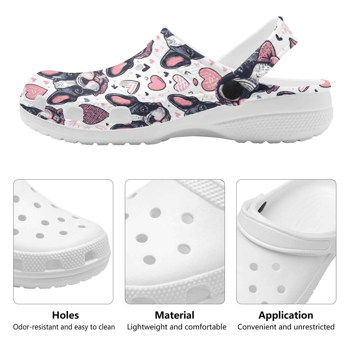 The clogs feature pivoting heel straps, echoing the adaptability of French Bulldogs to various environments, ensuring a secure and snug fit whether you’re on a casual walk or out on an adventure. This classic clog, a cult favorite, has been embraced by men and women alike, and is now ready to capture the hearts of French Bulldog enthusiasts with its playful and practical design.