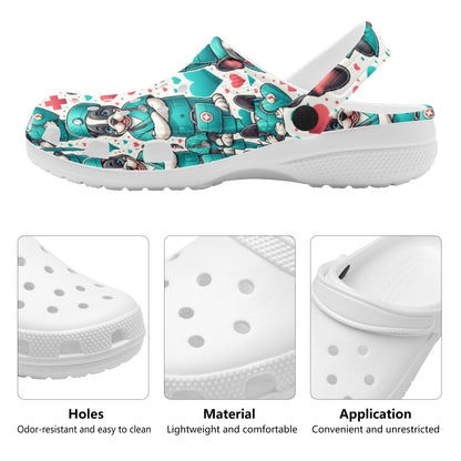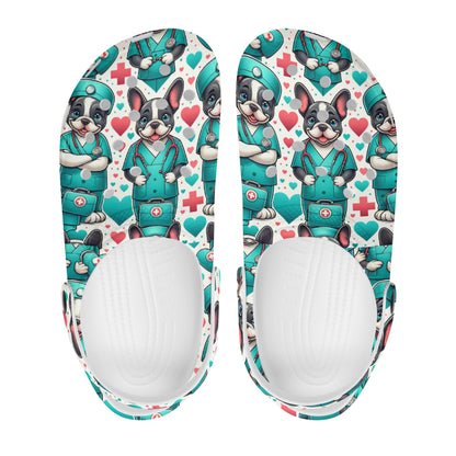 Ponte nuestros zuecos de espuma blanca brillante y lleva la alegría y la lealtad de los bulldogs franceses en cada paso. Ya sea en casa, haciendo recados o en escapadas de fin de semana, deja que la comodidad y el encanto canino guíen tu paseo.