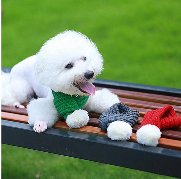 Dress up your French Bulldog in a cozy Christmas Knit Scarf featuring a cute pom-pom, ideal for winter warmth, style, and holiday vibes.