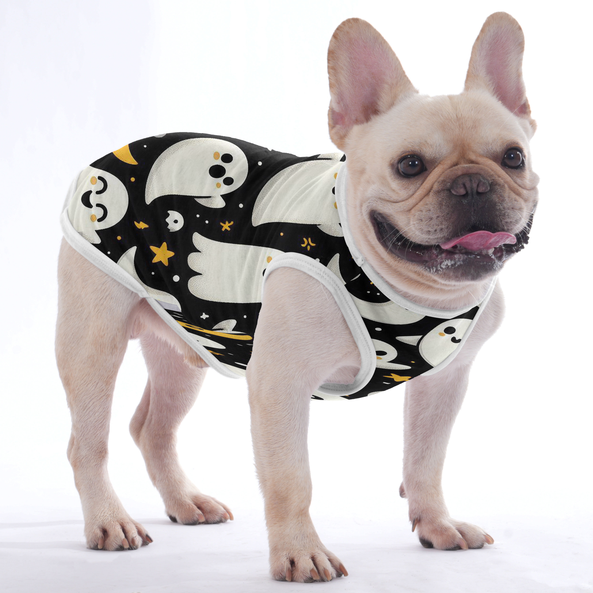 Give your pet the gift of festive fashion with a shirt made to combine playfulness and practicality. Order today and let your Frenchie shine in 'The Ghost' French Bulldog shirt.
