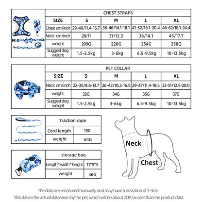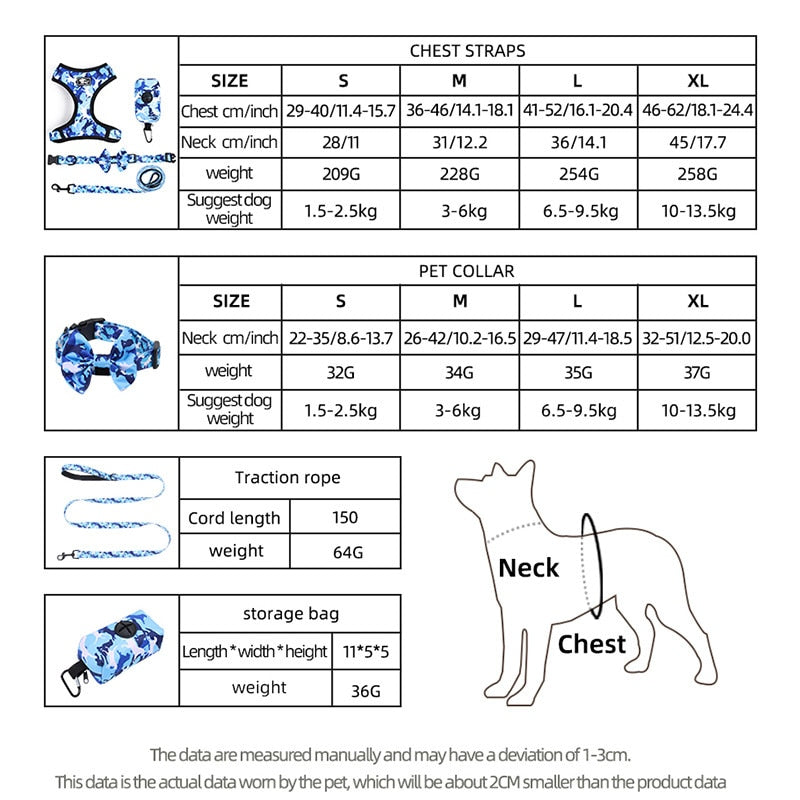 • The set consists of a harness, bow collar, multi-functional storage bag, and a leash