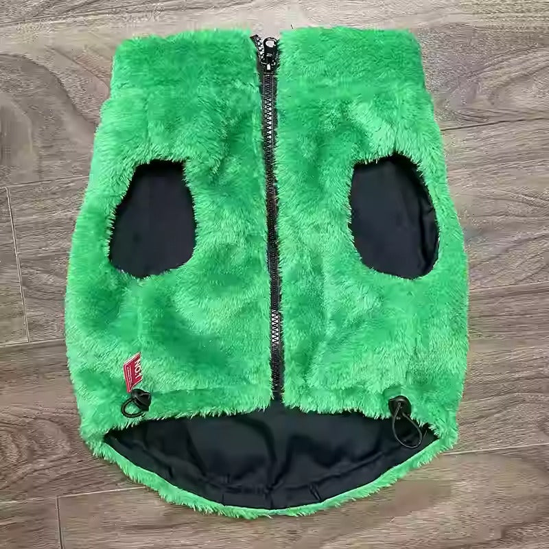 The lush, vibrant forest green color of the vest makes it a standout piece that catches the eye, while the fluffy texture invites touch and provides warmth. The black trim around the armholes and bottom edge frames your pet in elegance and ensures a snug fit that keeps the cold out.