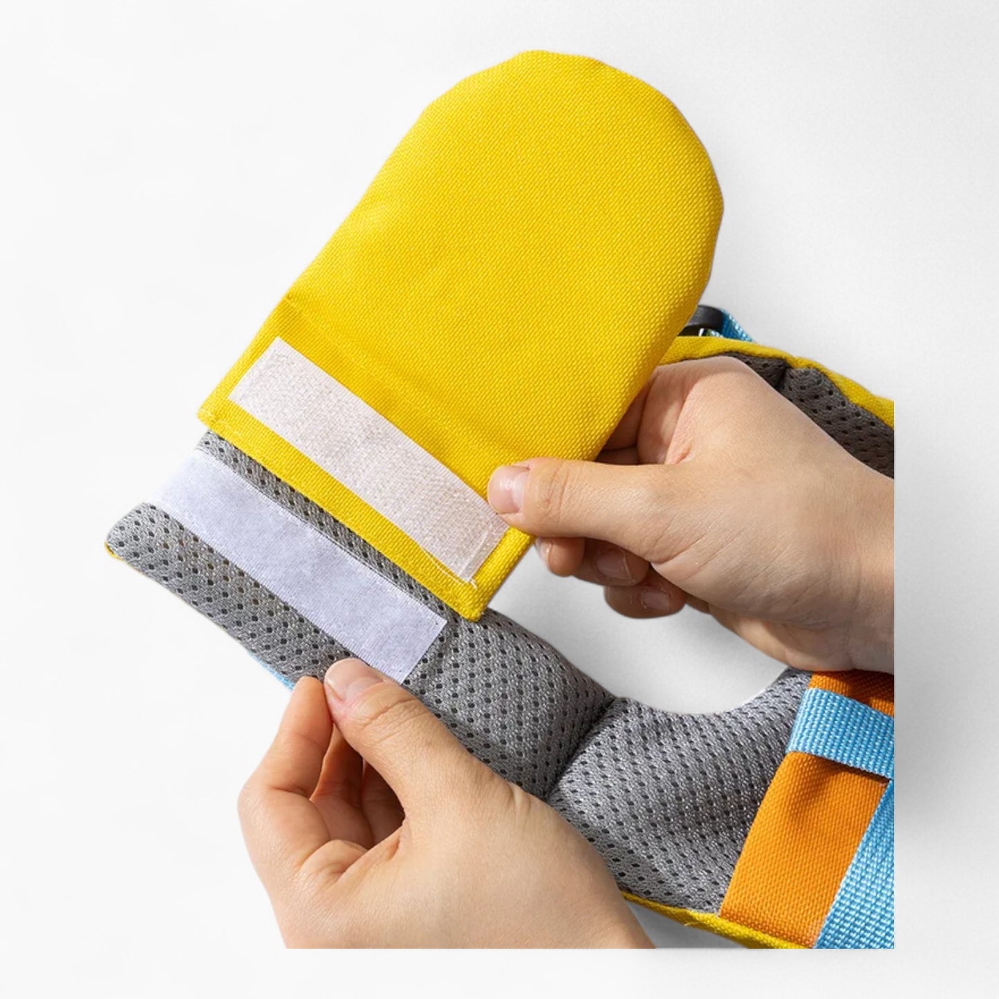 Hook-and-loop closures at the neck and belly add stability and prevent slippage.