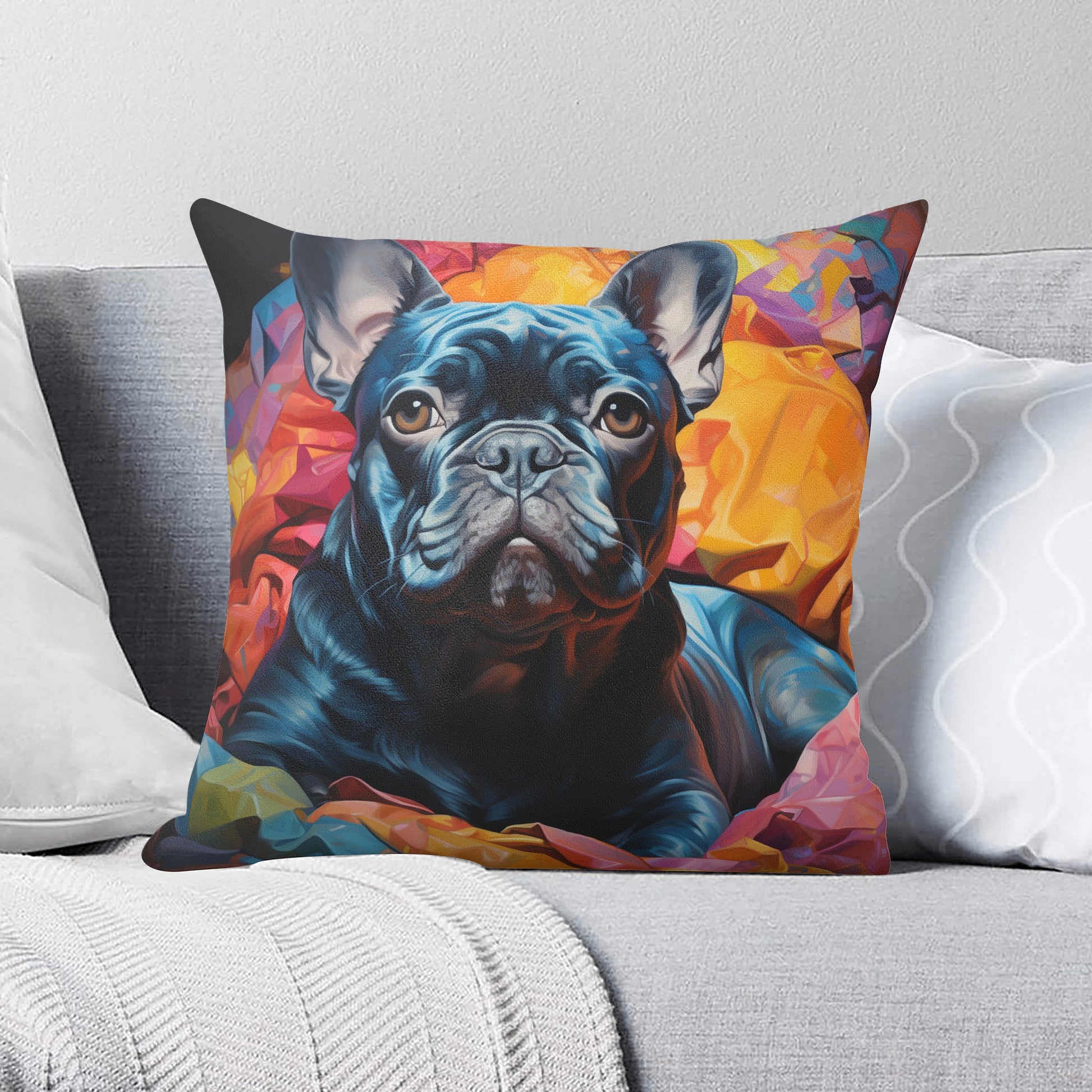 Designed for those who adore Frenchies, this pillow cover features a burst of colors in a captivating design. Crafted with care, it adds a cheerful and stylish touch to any space.